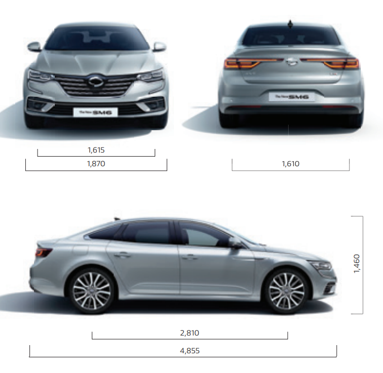 더 뉴 SM6 제원을 살펴보겠습니다. 전장은 4,855로 K5와 비교해보면 약 10정도 차이가 납니다. 전고 전폭은 거의 K5와 비슷한 크기라고 보시면 됩니다.