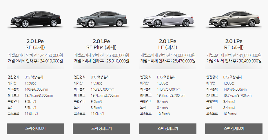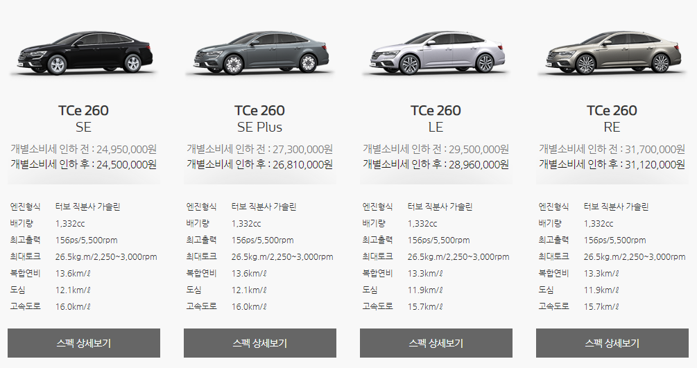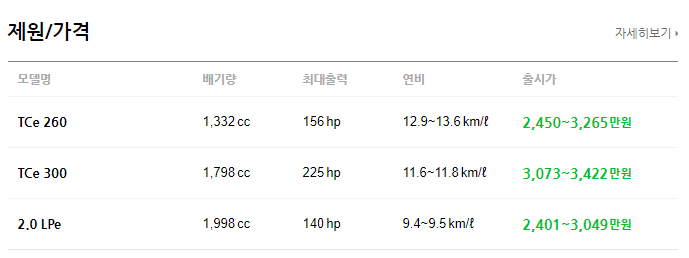 모델별 가격을 살펴보겠습니다. 모델은 총 3가지로 TCe 260, TCe 300, 2.0 LPe 입니다. 3가지 모델은 배기량이 모두 다르며, 세부트림과 옵션에 따라 출시가가 차이가 납니다.