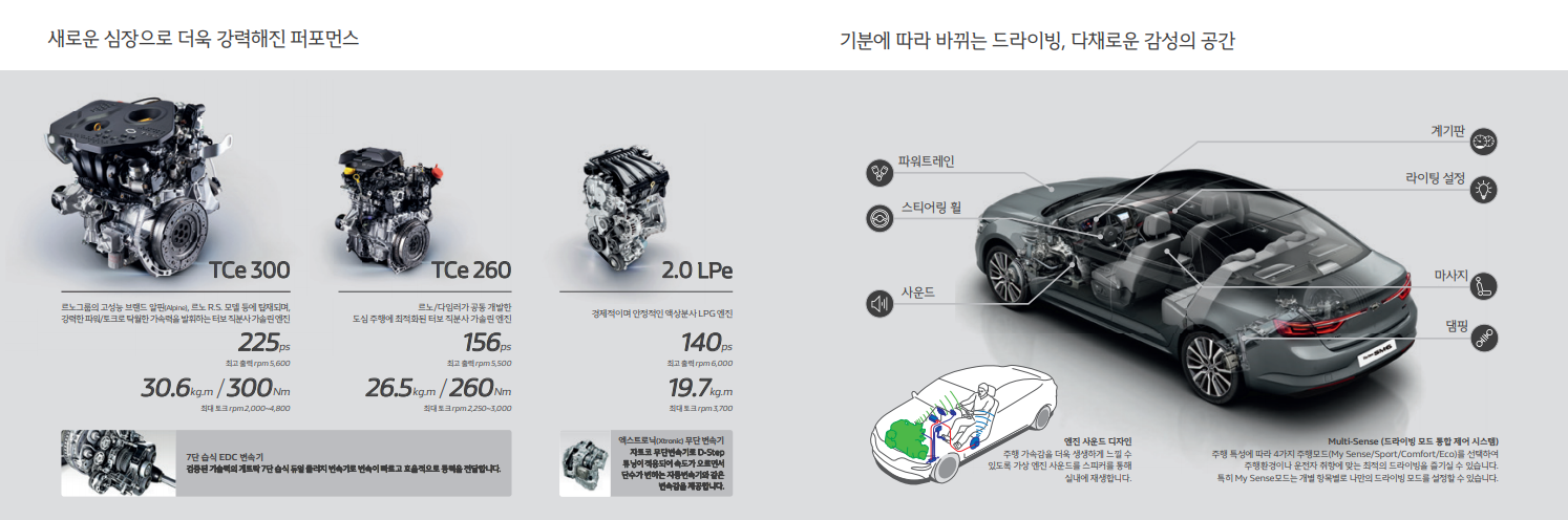 TCe 300 트림은 LE와 PREMIERE 두 가지 트림으로 분류 됩니다. 배기량은 1,800cc 이며 가솔린 방식입니다. 복합연비를 보면 약 12입니다. TCe 260과 가장 큰 차이는 베기량 차이 입니다. 그만큼 연기도 낮은 편입니다.