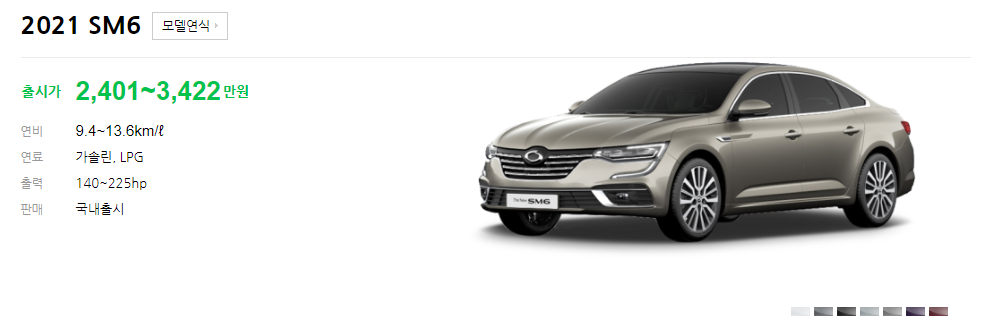 위의 이미지 처럼 원하시는 트림을 선택 후 옵션을 선택을 하시면 각 옵션별 가격이 나옵니다. 원하시는 옵션이 있는지 확인 하시면서 가격표 확인 해보시기 바랍니다. 다음은 2021 신형 더 뉴 SM6 내부 인테리어 및 외관 색상 정보 입니다.