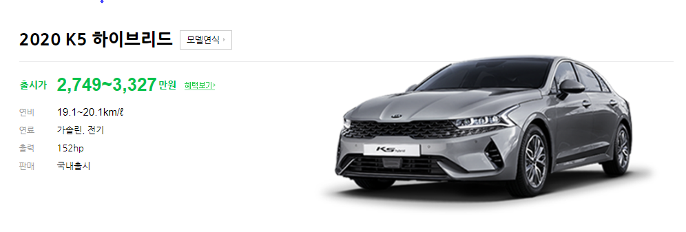 2020 K5 하이브리드는 옵션에 따라 2,749 ~ 3,327만원으로 출시되었습니다. 연비는 19.1~20.1로 하이브리드 답게 연비가 굉장히 좋습니다. 연료방식은 가솔린과 전기를 사용합니다.