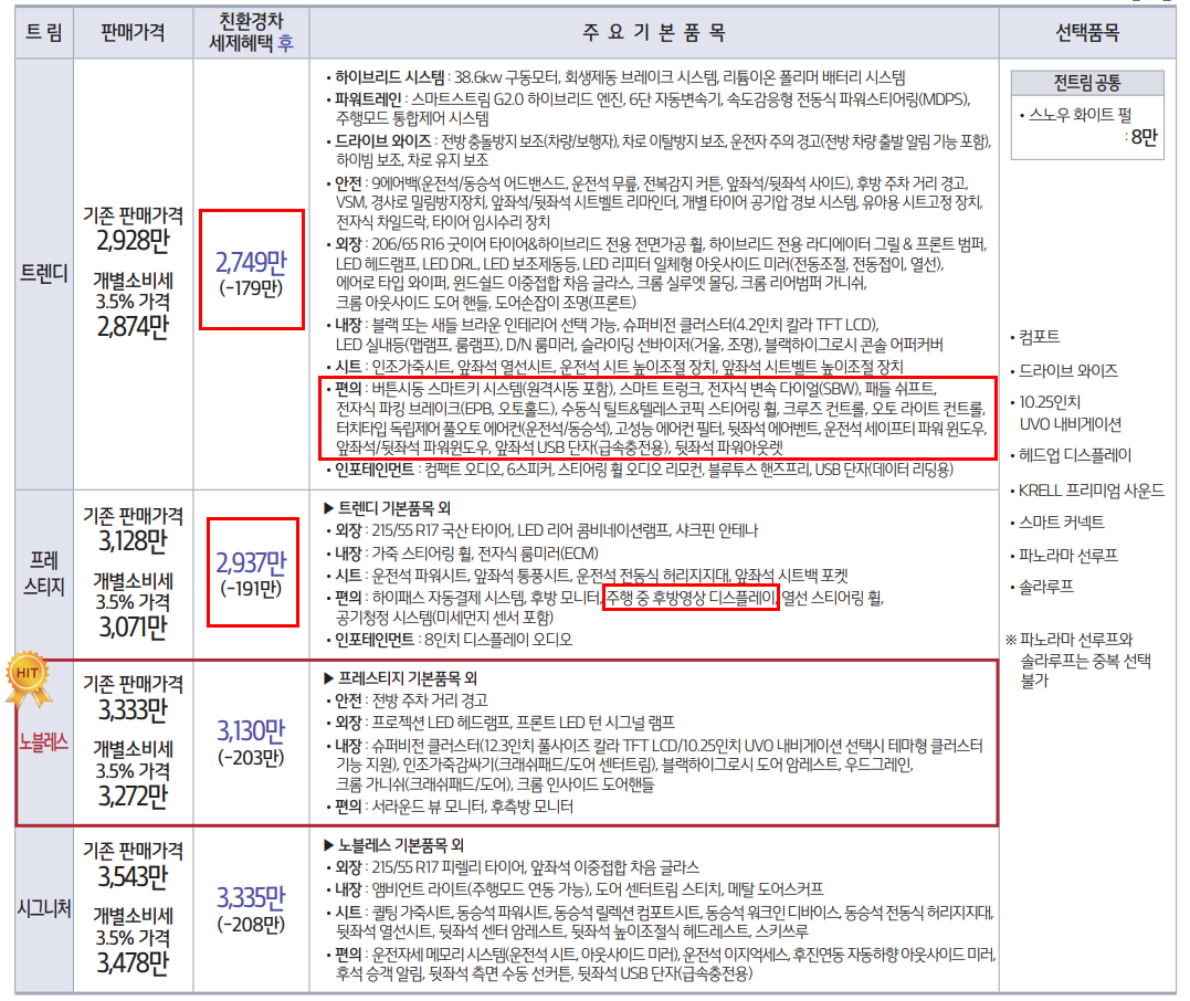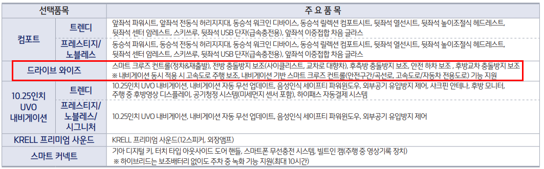 위의 이미지는 방금 언급드린 선택품목에 대한 트림별 추가 금액입니다. 원하시는 옵션의 내용을 잘 파악하시고 트림에 맞게 선택하시면 가성비 있게 구매가 가능합니다. 개인적으로 드라이브 와이즈 기능을 추천 드리는데, 운전자의 편리성과 안전성을 높여주는 옵션입니다.
