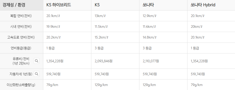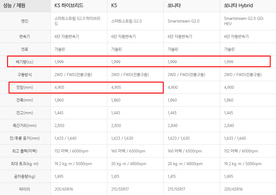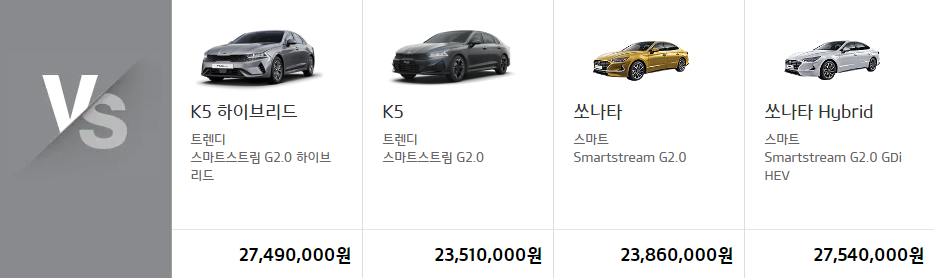2. K5 하이브리드 VS K5 VS 쏘나타 VS 쏘나타 하이브리드