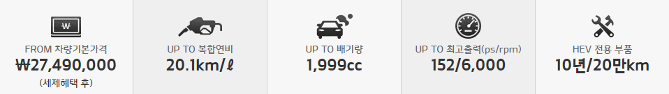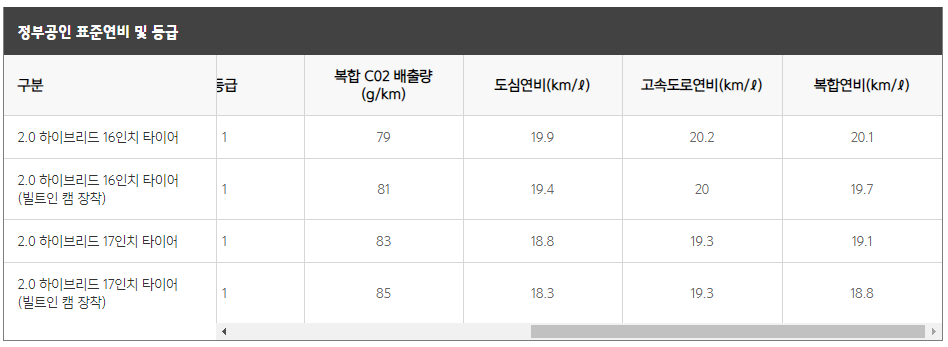 마지막으로 연비를 보자면 복합연비 기준 하이브리드는 동일하고 일반차량의 경우도 거의 차이가 없습니다. 이쯤되면 정말 디자인의 차이와 그 달희 혜택에 달려있다고 보면 되겠습니다.