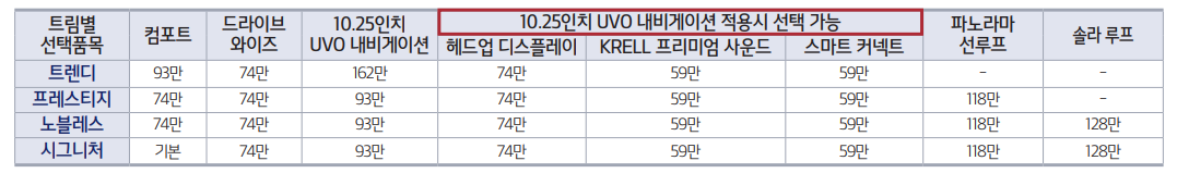 여기서 눈여결 볼 부분은 각 트림별 가격차이에서 본인이 원하는 옵션이 어느정도 포함되어있는지 확인 하시고 원하시는 옵션이 선택품목에서 원하시는 옵션만 개별 구매하여 트림에 추가하는 것도 좋은 방법 입니다.