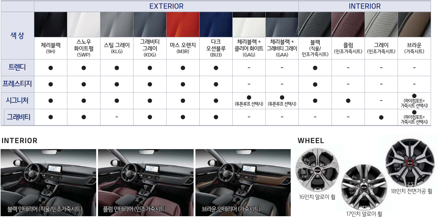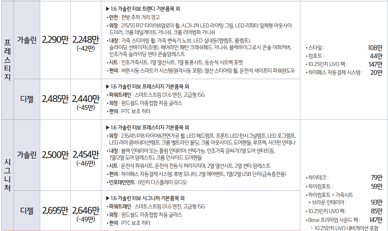 프레스티지와 시그니처 트림 역시 가솔린과 디젤로 나뉘며, 추가 기본품목 또한 디젤이 트렌디의 동일하여 가격이 상승하였습니다. 등급이 올라가면서 눈에 띄는 품목은 편의 시설에 버튼시동 스마트키 시스템 그리고 후방 모니터 등이 있습니다.