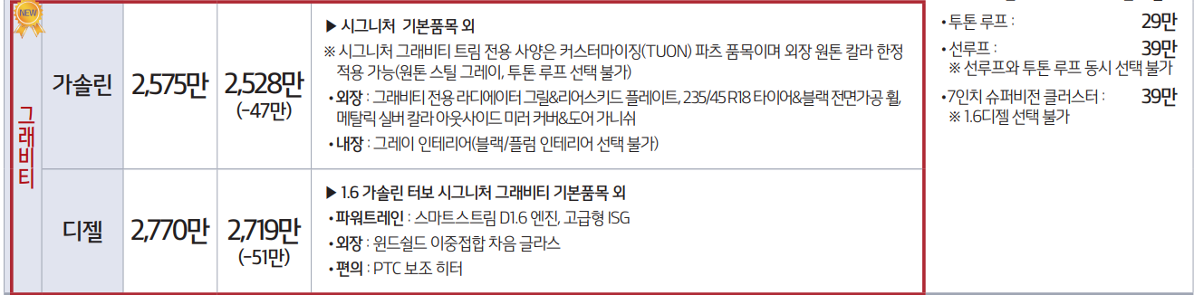 가장 최고급 트림인 그래비티는 가솔린 2,575만원 디젤이 2,770만원으로 추가 기능은 동일 합니다. 개인적으로 상위 버전으로 갈수록 외장과 내장의 인테리어의 추가 많아 디자인적으로 원하시는 분들은 고급 트림을 선택하시면 좋고, 인테리어 보다 기능에 집중하시는 분들은 기본 트림에 원하시는 선택옵션을 추가 하시는걸 추천 드립니다.