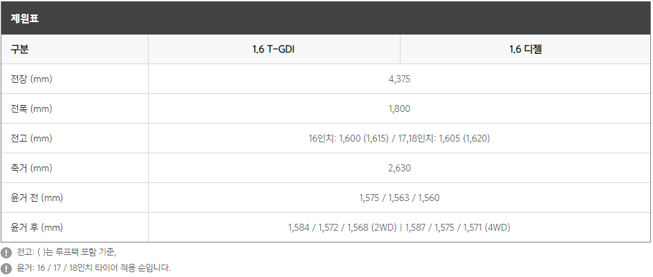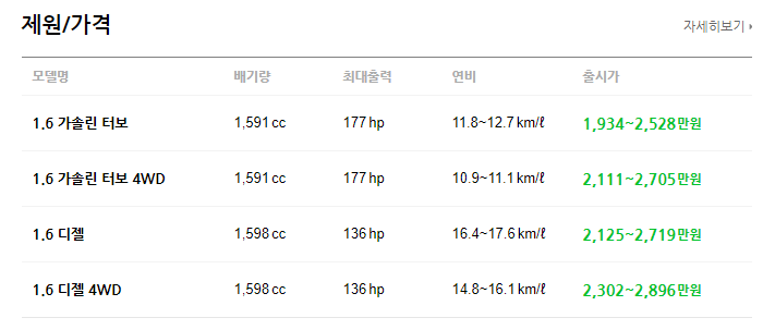 다음은 모델별 차이를 간단하게 확인 해보도록 하겠습니다. 우선 총 4가지 모델로 1.6 가솔린터보, 1.6 가솔린 터보 4WD, 1.6 디젤, 1.6 디젤 4WD 입니다. 여기서 4WD 모델은 옵션에서 선택이 가능 합니다. 배기량은 모두 1,600cc로 동일하며 연료방식에 따라 연비와 출시가 차이가 나니 참고 하시기 바랍니다.