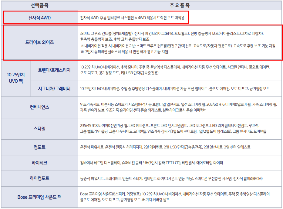 추천드리는 옵션은 드라이브 와이즈로 운전자의 주행에 편리함을 더해주고 안전하게 운전하는데 큰 역할을 하는 기능 들 입니다. 모든 트림에 드라이브 와이즈 기능이 일부 포함되어 있지만, 풀 옵션 드라이브 와이즈를 고려하시는 분들에게 추천 드립니다.