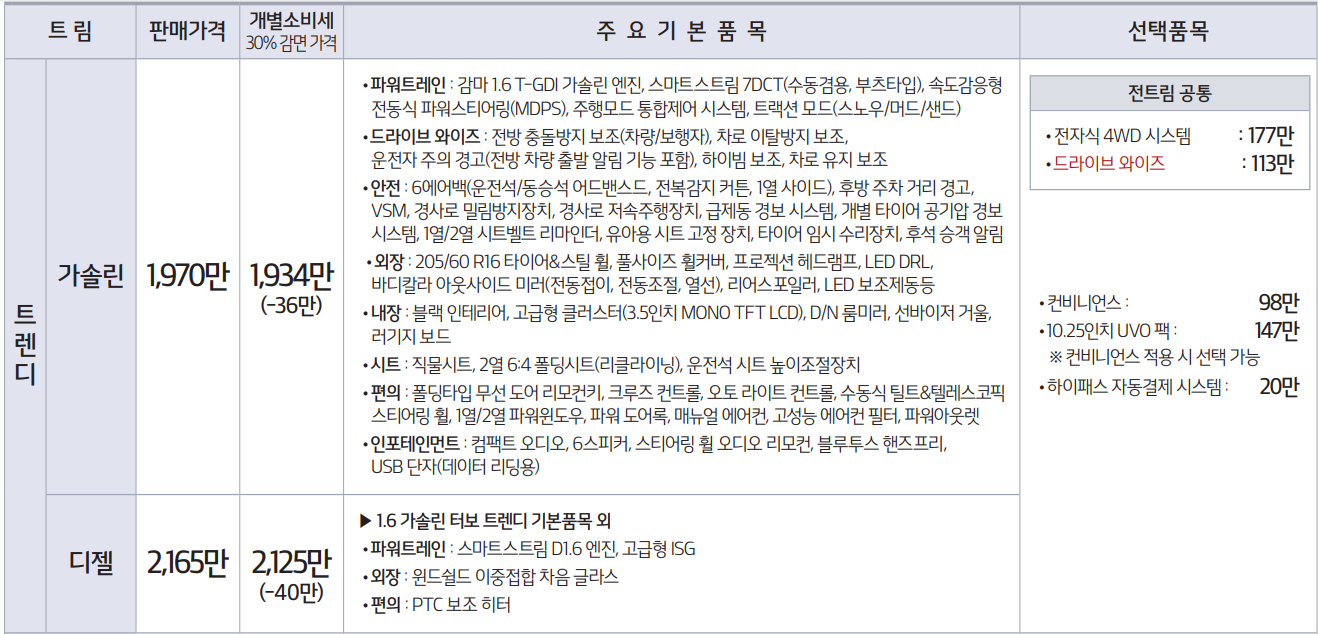 트렌디는 가솔린과 디젤 가격이 1,970만원, 2,165만원으로 출시되었습니다. 트렌디 디젤 트림에 파워트레인과 PTC 보조히터 등이 포함되어 가격이 일부 상승 했으며, 그 외에 품목은 동일 합니다. 눈여결 볼 기본 항목으로 기본품목에 드라이브 와이즈 기능이 들어가 있다는 점 입니다. 운전자의 편리성을 위한 기능이라 유용 합니다.