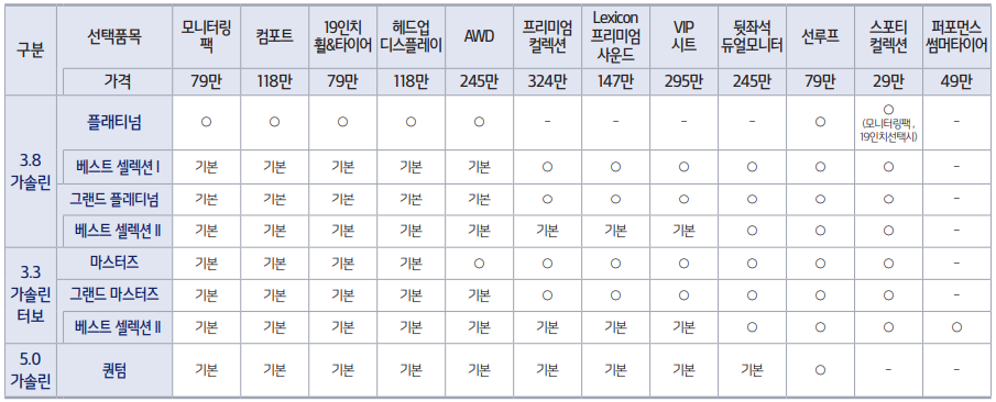 그랜더 플래티넘 베스트 셀렉션 2를 기본 품목으로 하며 파워트레인으로 V8 타우 5.0 GDI 가솔린 엔진으로 변경이 됩니다. 그 외에는 부가적인 옵션 사항입니다. 선택품목 선루프만 있듯이 풀옵션이라고 보시면 됩니다. 출시가는 9,357만원 입니다.