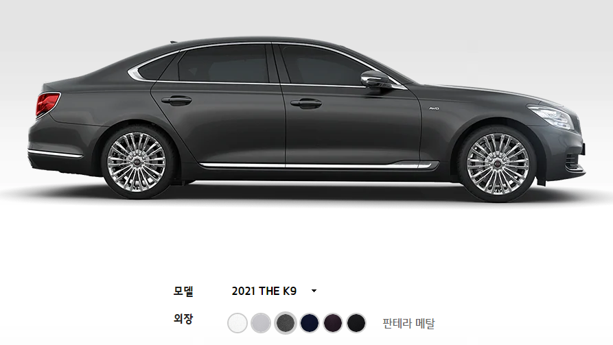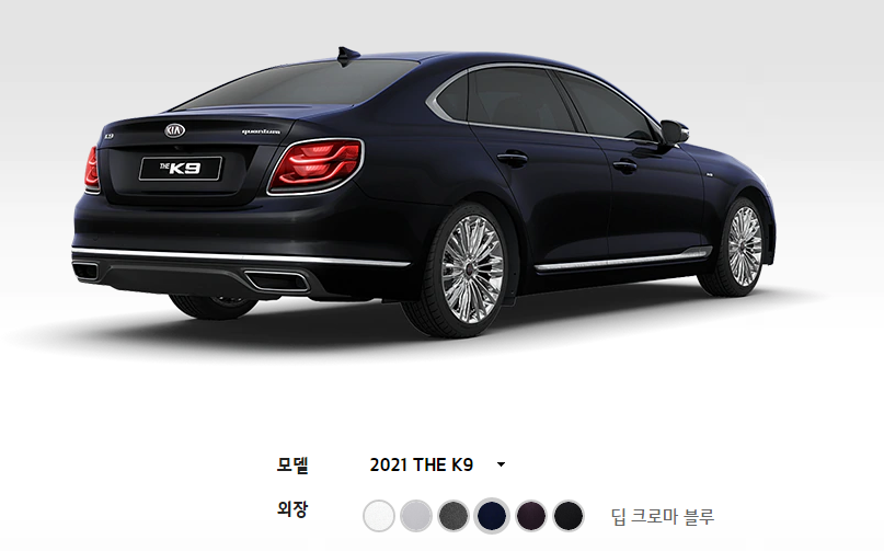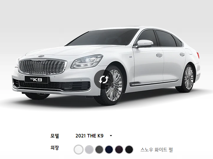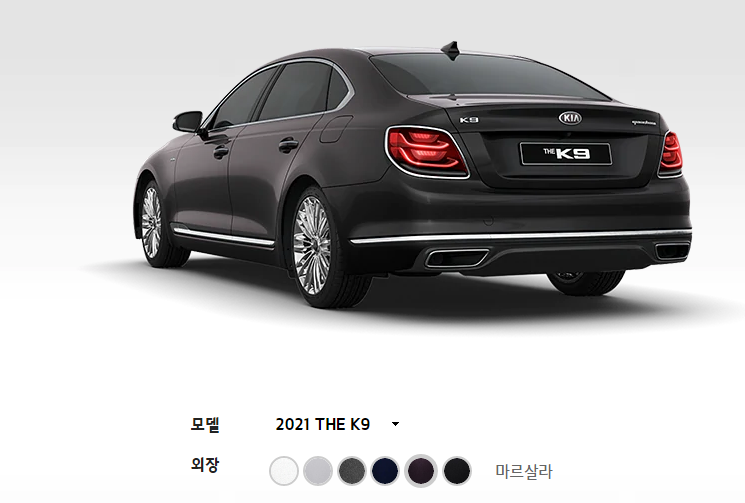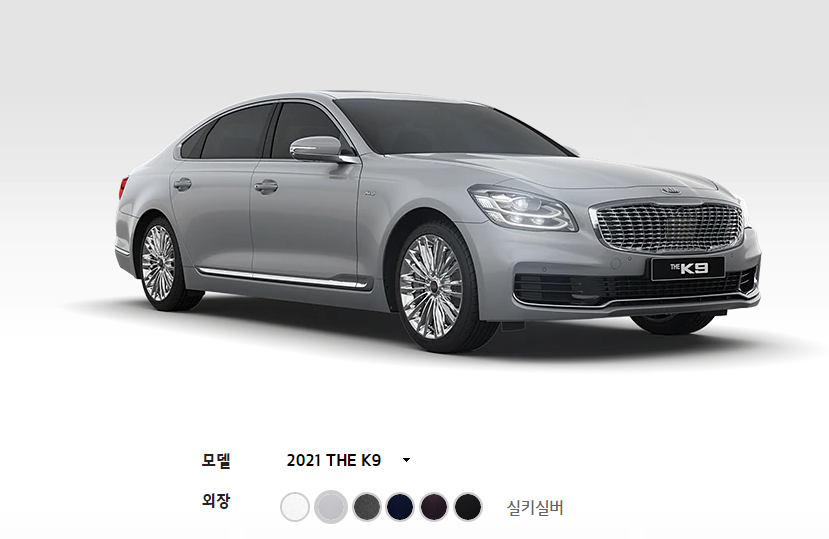 2021 K9 외부 색상은 스노우 화이트 펄, 판테라 메탈, 마르살라, 실키 실버, 딥 크로마 블루, 오로라 블랙 펄로 총 6가지의 색상이 있습니다. 화면으로 보시는 것돠 실물은 다르기 때문에 꼭 실물을 보시고 선택 하시기 바랍니다. 그리고 외부 인테리어는 블랙, 베이지, 새들 브라운, 시에나 브라운으로 총 4가지의 선택이 가능 합니다.