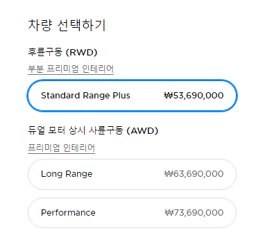 테슬라 모델3 차량 선택 옵션 첫번째는 스탠다드 레인지 플러스(Standard Range Plus) 입니다. 가격은 53,690,000원 으로 RWD 후륜구동을 사용하고 있습니다.