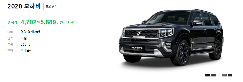 2020 신형 모하비 더 마스터 출시가는 4,702~5,689만원 입니다. 트림에 따라 약 1,000만원 가량 차이가 납니다. 연료방식은 디젤이며 연비는 9.3~9.4 입니다. 연비 부분은 하단에서 자세히 알아보겠습니다.