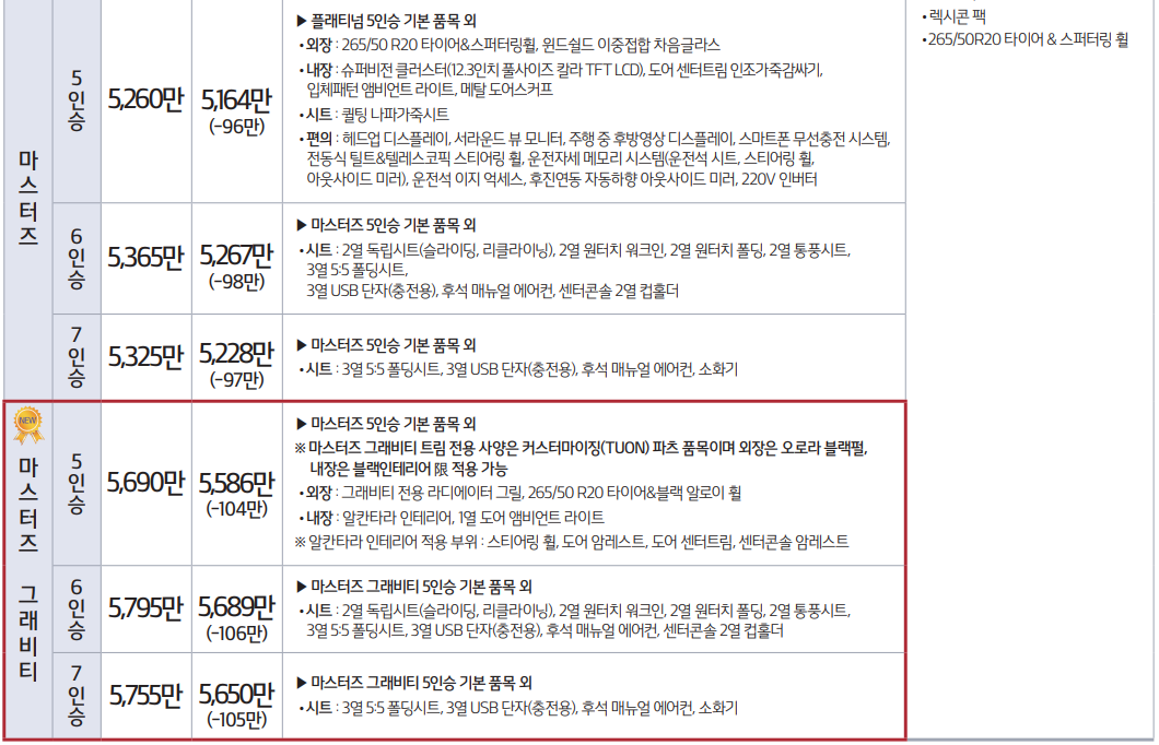 마스터즈 그래비티는 휠과 내부 인테리어가 변경 됩니다. 그래서 가격차이는 마스터즈와 약 300만원 내외 입니다. 원하시는 옵션을 잘 체크 하셔서 차량의 트림을 고르시는 것이 가장 현명한 선택이니 참고 하시기 바랍니다.