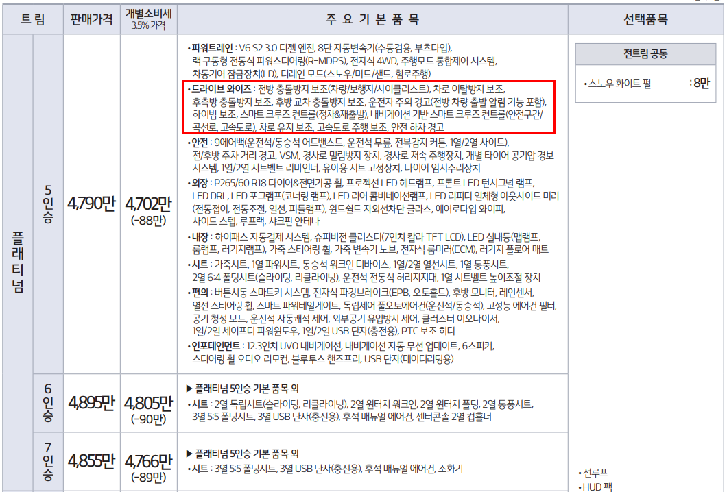 각 트림별 가격표 입니다. 265/50 R20 타이어&스퍼터링 휠은 플래티넘에만 옵션으로 적용되니 참고하시기 바랍니다. 특이점은 드라이브 와이즈 같은 고급옵션들은 이미 기본트림 부터 포함되기 때문에 내장 외장 옵션만 있다고 보시면 됩니다.