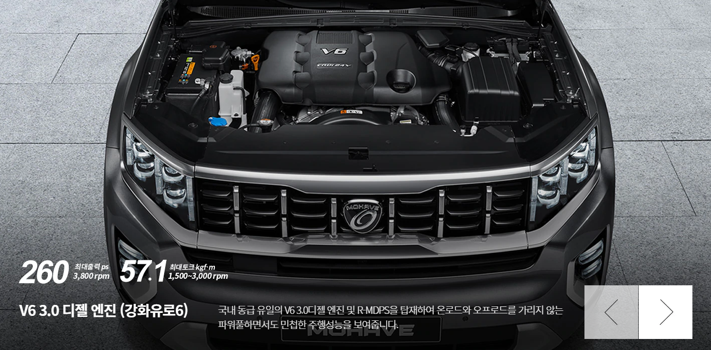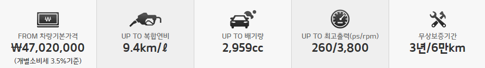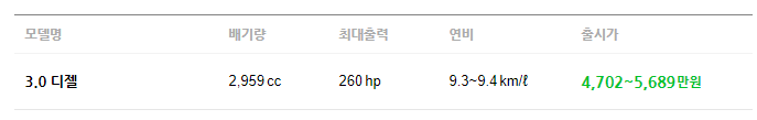 모델은 3.0 디젤 한가지 입니다. 배기량은 2,959cc로 3,000cc 라고 보시면 됩니다. 배기량 및 엔진에 대해는 하단에서 자세히 알아보도록 하겠습니다.