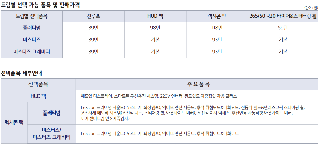 3. 2020 모하비 더 마스터 트림별 선택품목 및 가격 안내표