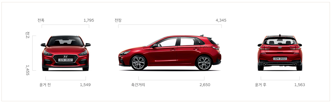전장은 4,345 전폭 1,795 전고 1,455로 전체적인 사이즈는 해치백에 맞게 잘 나왔습니다. 외관에서 보는 사이즈보다 실내 디자인이 잘 나와서 내부는 더 넓어 보이는 것이 특징이자 장점 입니다. 실내 내부는 직접 시승해보시면 더 감이 오실 겁니다.