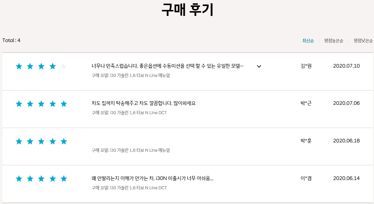 2020 i30 N라인 외부 색상은 7가지 색상으로 선택이 가능하며 내부는 한가지로 통일 됩니다. 간단하게 구매 후기를 보도록 하겠습니다. 현대자동차 홈페이지에 올라온 후기 입니다.