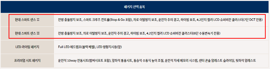 원하시는 종류의 옵션을 잘 확인 하시고 선택 하시면 더욱 고성능 차량으로 업그레이드 하실 수 있습니다. 위에서 추천 드린 현대 스마트 센스 패키지가 좋은 예 입니다.