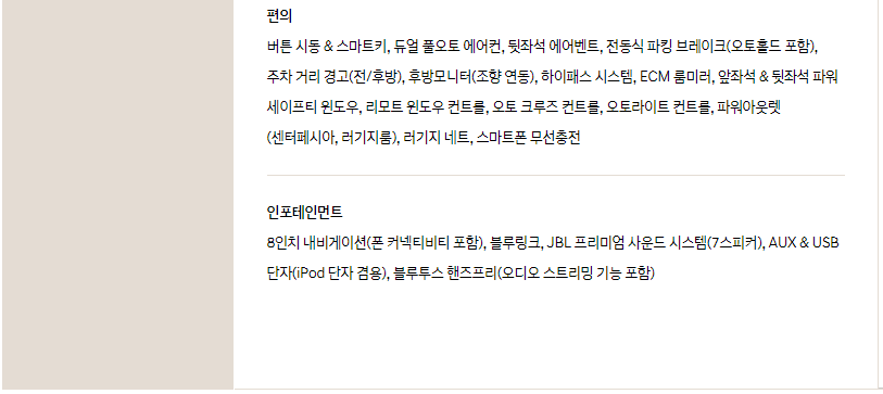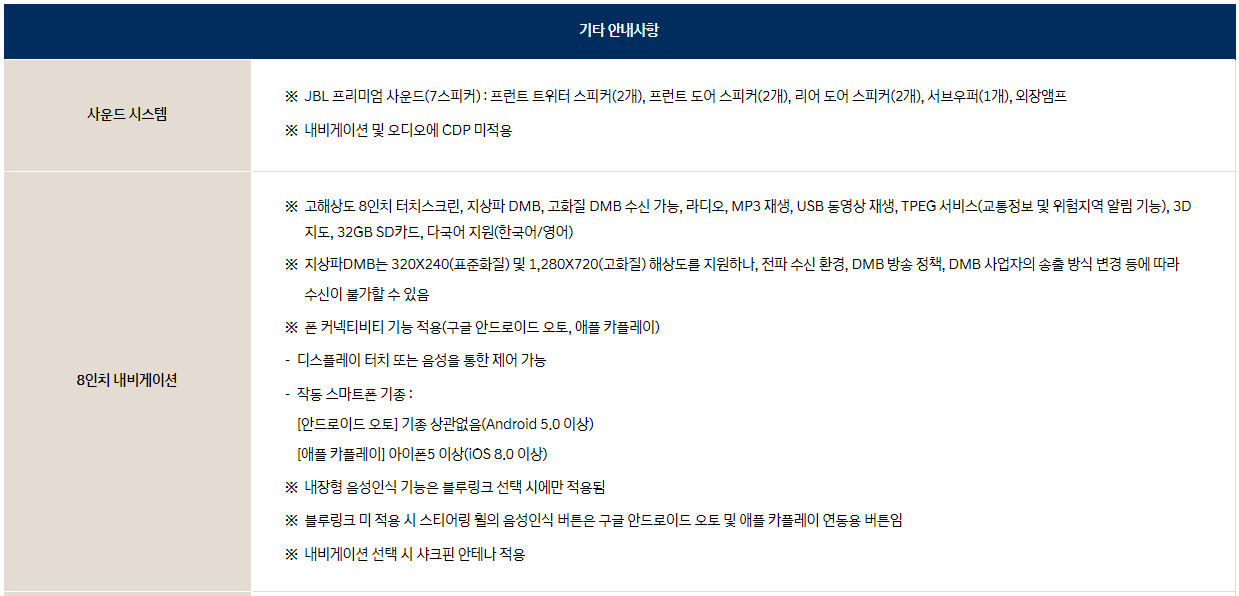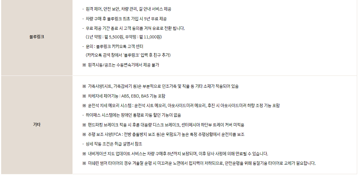 다음은 기타 부가적인 선택 옵션에 대한 상세 내용을 살펴보도록 하겠습니다. 사운드 시스템, 8인치 네비게이션, 블루링크 등이 있습니다. 자세한 내용은 하단을 참고 해주시기 바랍니다.
