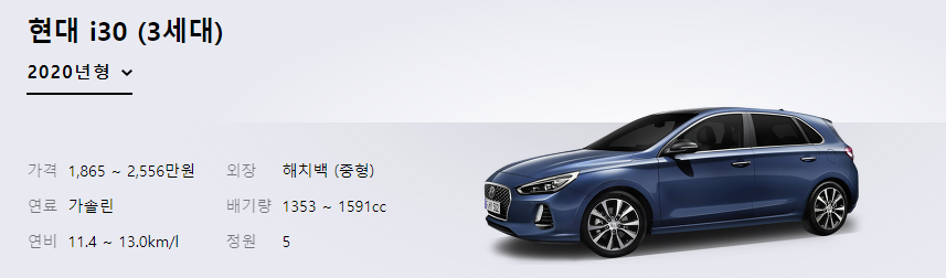 i30 출시가는 1,865~2,556만원으로 모델 및 트림 그리고 옵션에 따라 약 700만원 가량 차이가 납니다. 해치백에 중형이며 연료방식은 가솔린, 배기량은 1353~1591cc까지 입니다. 연비는 11.4~13.0로 나쁘지 않은 편입니다.
