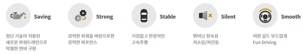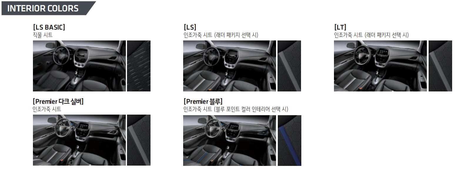 내부 인테리어는 총 5가지 입니다. 베이직은 직물 시트 이며, 트림별로 선택 가능한 항목이 있으니 위의 이미지를 참고 하시기 바랍니다.