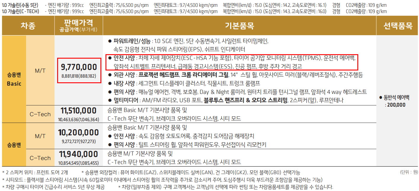 승용밴 라인은 2가지 차종으로 나뉩니다. 승용밴 Basic, 승용밴 입니다. 트림은 M/T, C-Tech 2가지 입니다. 안전 사양이 기본 트림 부터 포함되어 있기 때문에 1,000만원 미만 임에도 불구하고 굉장히 잘 나왔습니다. 가격은 하단의 가격표를 봐 주시기 바랍니다.