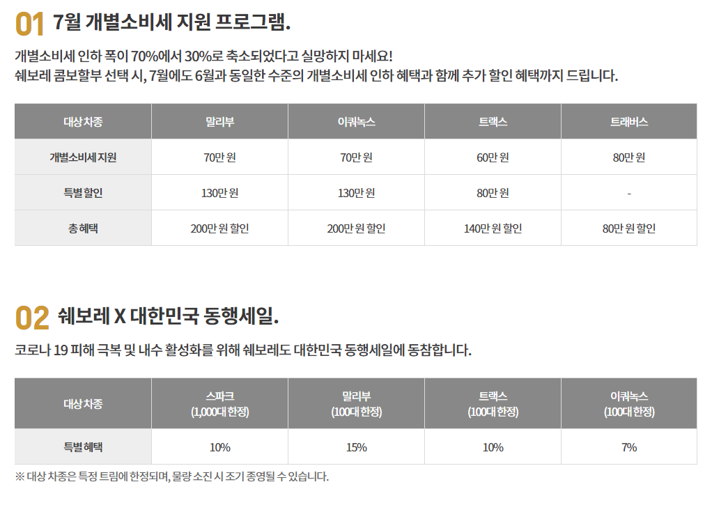 7월은 개별소비세 인하 혜택과 함께 추가 할인 까지 들어갑니다. 그리고 코로나 19 피해 극복을 위한 특별혜택으로 스파크의 경우 1,000한정으로 10% 할인 적용 됩니다. 8월의 경우에는 달라 질 수 있으니 쉐보레 사이트에서 확인 하시기 바랍니다.