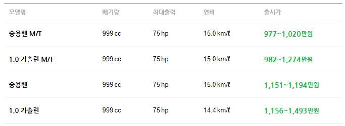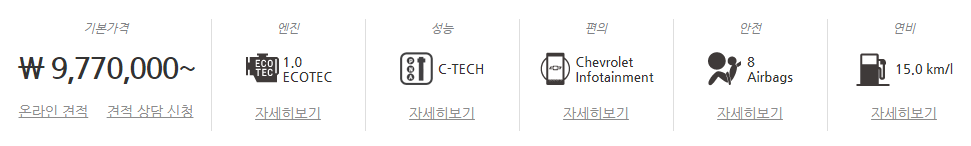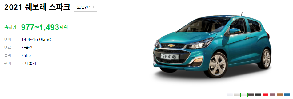 먼저 간단하게 쉐보레 스파크 대략적인 출시가 및 정보를 알아보고 항목 별로 하단을 통해서 자세히 알아보도록 하겠습니다.