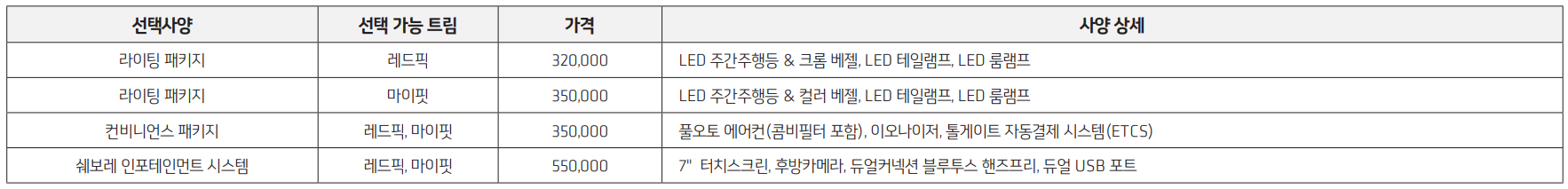다음은 2021 쉐보레 스파크 선택항목(옵션)에 대해서 알아보도록 하겠습니다.