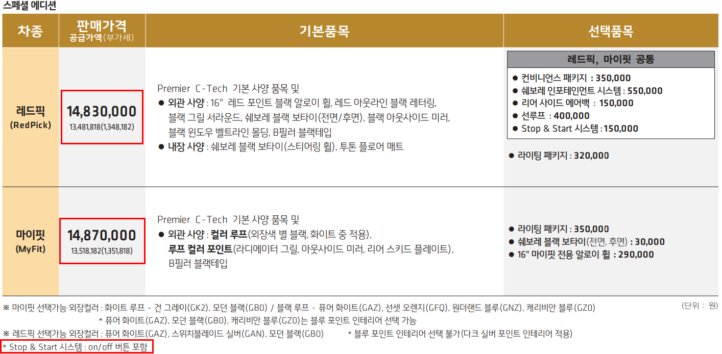 스페셜 에디션 라인은 레드픽, 마이핏으로 나뉩니다. Premier C-Tech를 기본사양으로 하며 외관과 내장 사양이 색상 및 인테리어 다소 변경 됩니다. 개성있는 차량을 원하시는 분들에게 추천 드립니다.