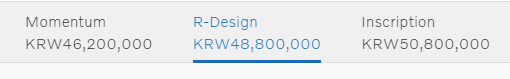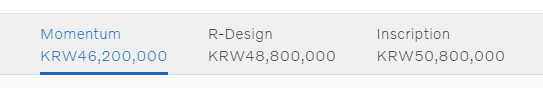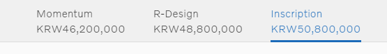 트림은 총 3가지 입니다. Momentum, R-Design, Inscription 입니다. 가격은 하단과 같으며 트림을 선택하신 후 색상 -> 휠 -> 차량 외부 색상 -> 차량 내부 ->추가 옵션을 선택하시면 최종 금액을 확인 할 수 있습니다.