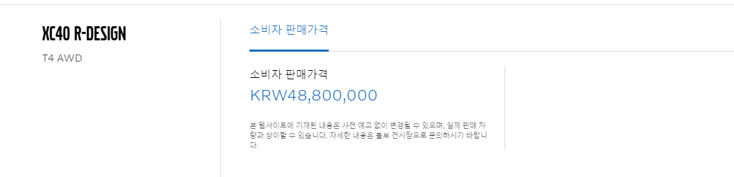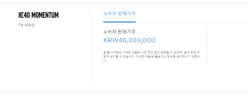 2020 볼보 XC 40 가장 기본트림에 원하는 색상을 고르고 정해진 기본옵션과 최종 추가 옵션을 모두 추가 하면 46,200,000원 입니다.