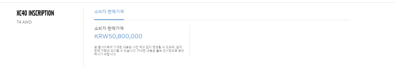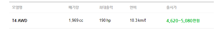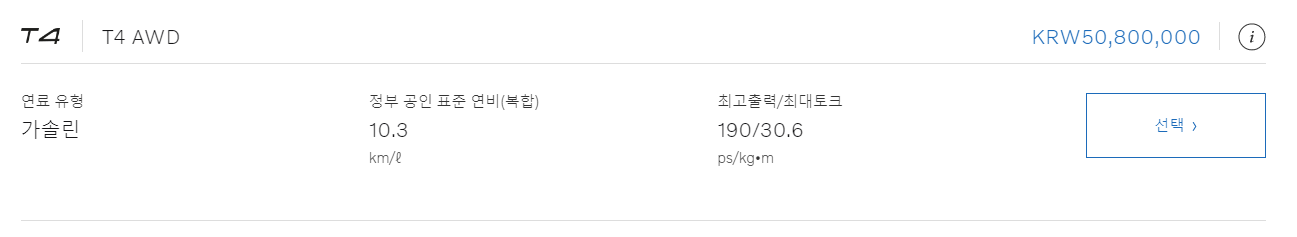 2020 볼보 XC40의 배기량은 1,969cc 입니다. T4 AWD 모델 한 라인 입니다. 해당 모델 라인에 3가지의 트림이 있으며 트림별로 사양이 다릅니다. 하단을 통해 확인 해보도록 하겠습니다.
