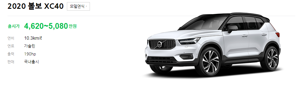 2020 볼보 XC40 출시가는 4,620~5,080만원으로 트림과 옵션에 따라 약 400만원 가량 차이가 납니다. 연료는 가솔린 방식만 구매가 가능합니다. 연비는 10.3으로 SUV 치고 잘 나오는 편 입니다.