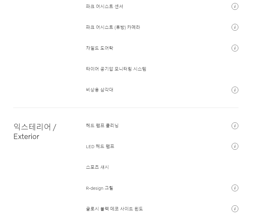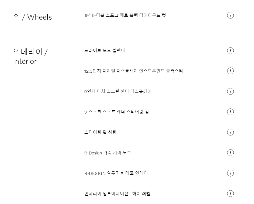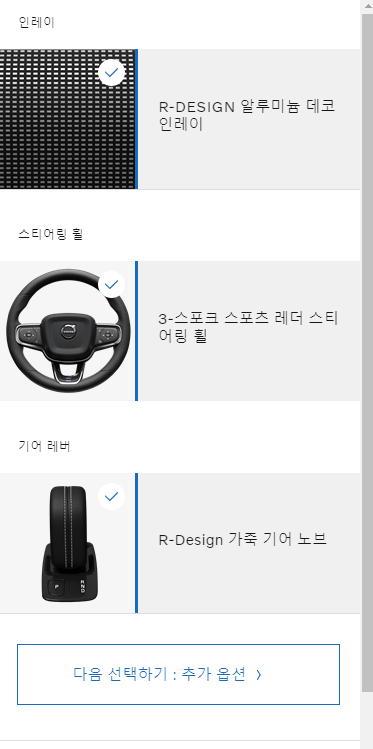 기본적으로 선택된 옵션으로 추가 가능 선택옵션은 없습니다. R-DESIGN 알리미늄 데코 인레이와 3-스포크 스포크 레더 스티어링 휠, R-Design 가죽 기어 노브가 적용 됩니다.