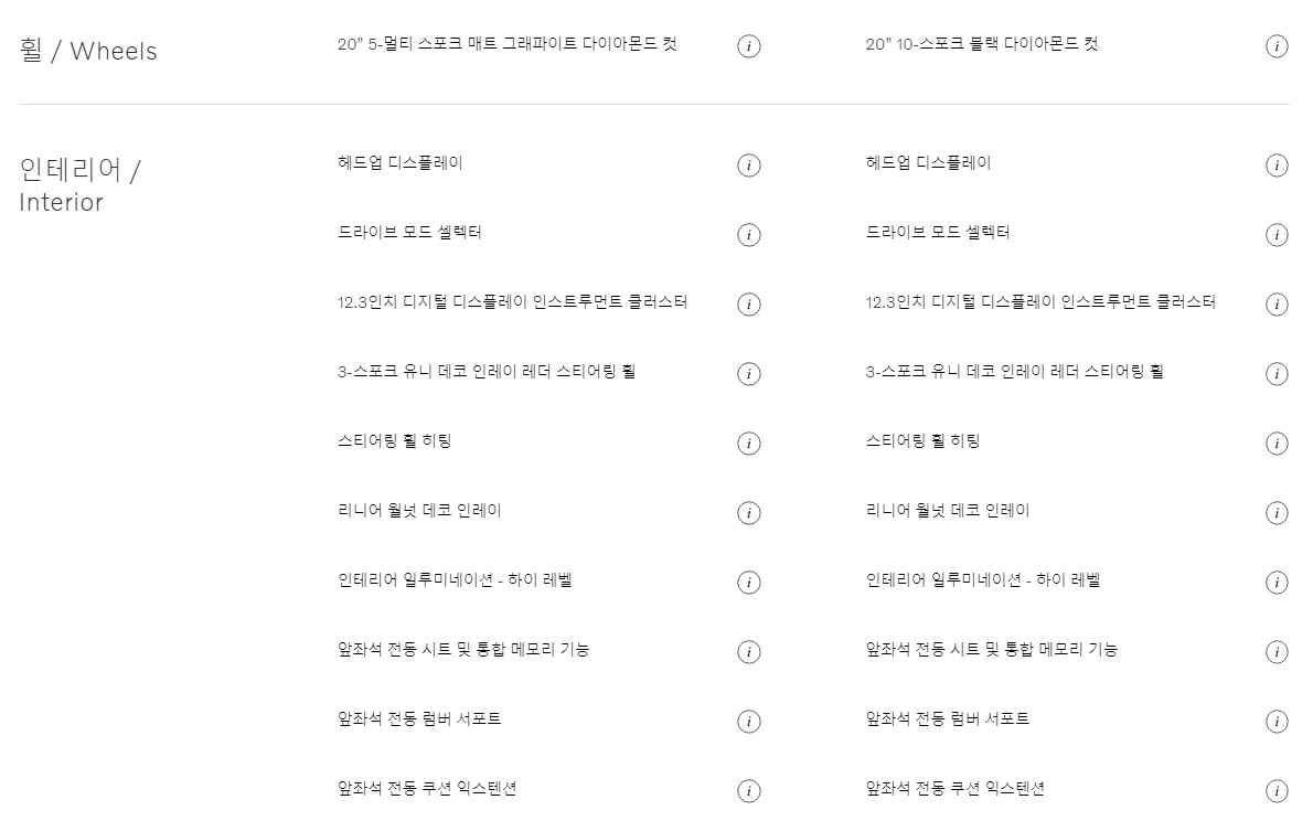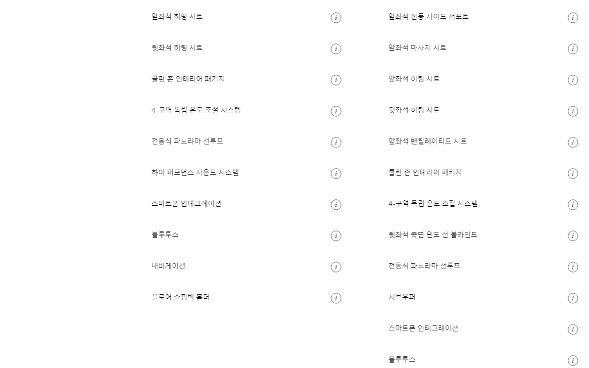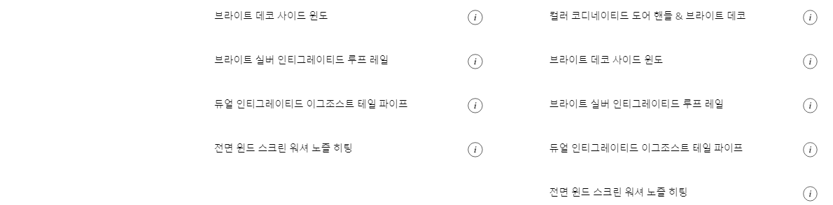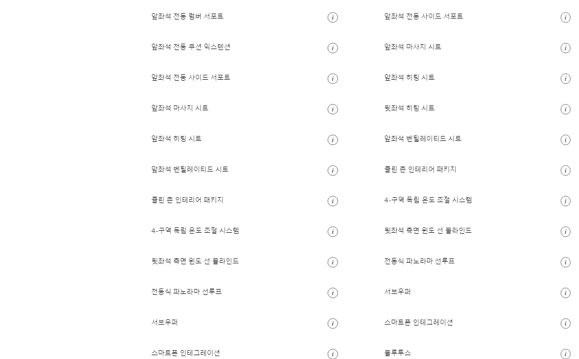 트림별로 기본 옵션 사항이 조금씩 다르기 때문에 위의 이미지를 통해 상세하게 확인 해보시기 바랍니다. 휠과 내부 인테리어가 차이가 있습니다. 참고 해보시기 바랍니다. 다음은 추가옵션 사항입니다.