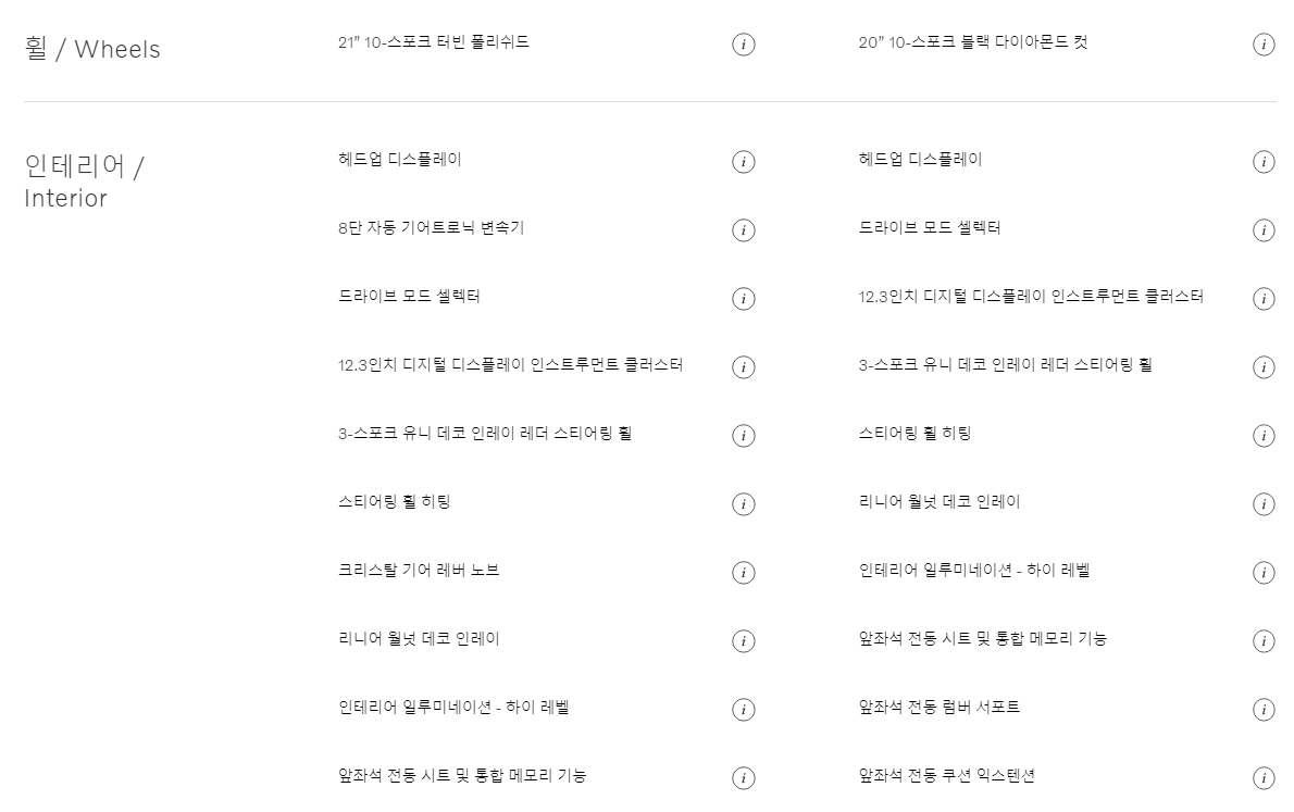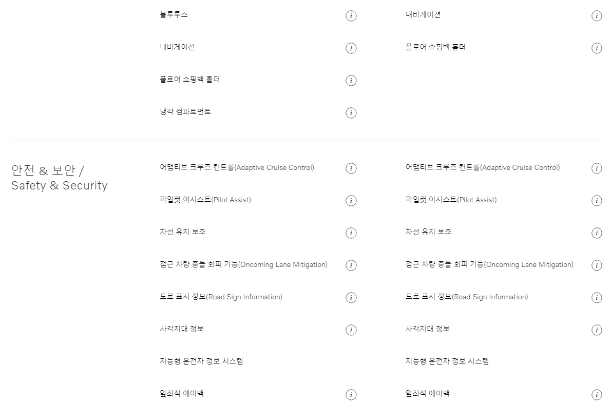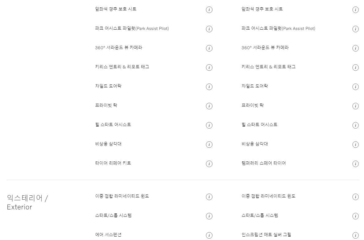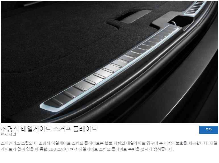 트림별로 기본 옵션 사항이 조금씩 다르기 때문에 위의 이미지를 통해 상세하게 확인 해보시기 바랍니다. 휠과 내부 인테리어가 차이가 있습니다. 참고 해보시기 바랍니다. 다음은 추가옵션 사항입니다.
