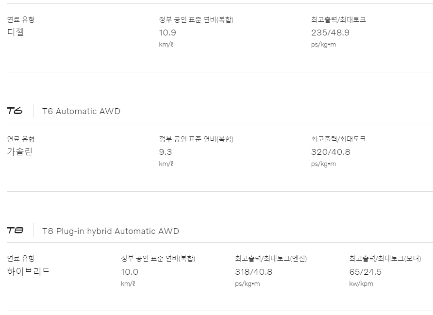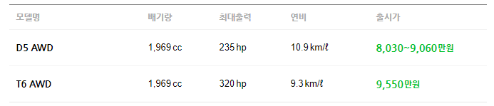 다음은 모델에 대한 간단한 정보 입니다. 모델은 2가지로 D5 AWD, T6 AWD 입니다. 배기량은 1,969cc 이며 연비는 9.3~10.9 입니다.