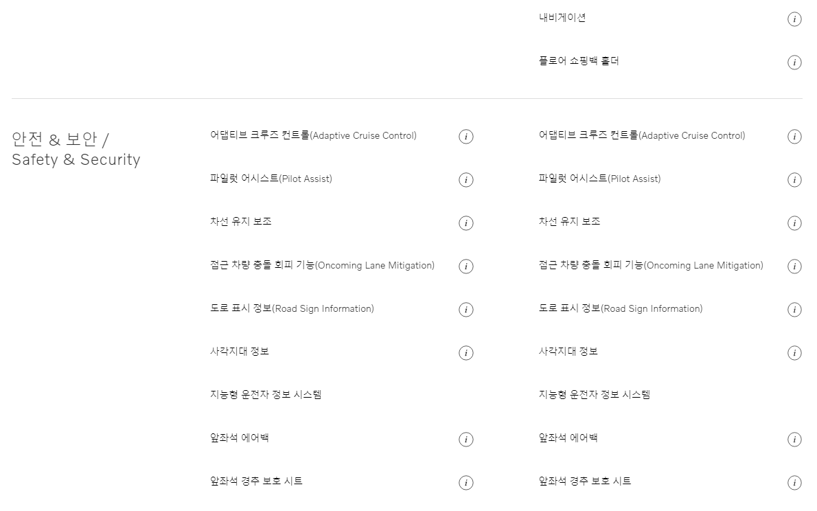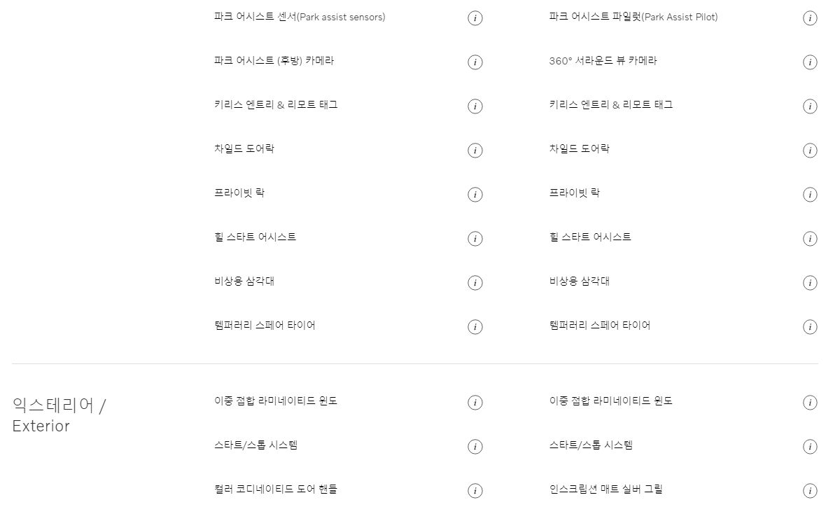 Momentum과 Inscription 트림은 가격은 약 1,000만원 차이가 납니다. 위의 이미지를 보시면 인테리어 부분의 앞좌석 마사지 시트, 앞좌석 벤틸레이티드 시트 등 그리고 안전 & 보안 부분은 파크 어시스트 파일럿 360도 서라운드 뷰 카메라 등이 추가 되었습니다.