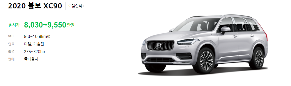 2020 볼보 XC90 출시가는 8,030~9,550만원 입니다. 옵션 및 모델별로 약 1,500만원 정도 차이가 납니다. 연료방식은 디젤과 가솔린 선택 가능 합니다. 연비는 9.3~10.9로 SUV 표준 정도라고 볼 수 있습니다.