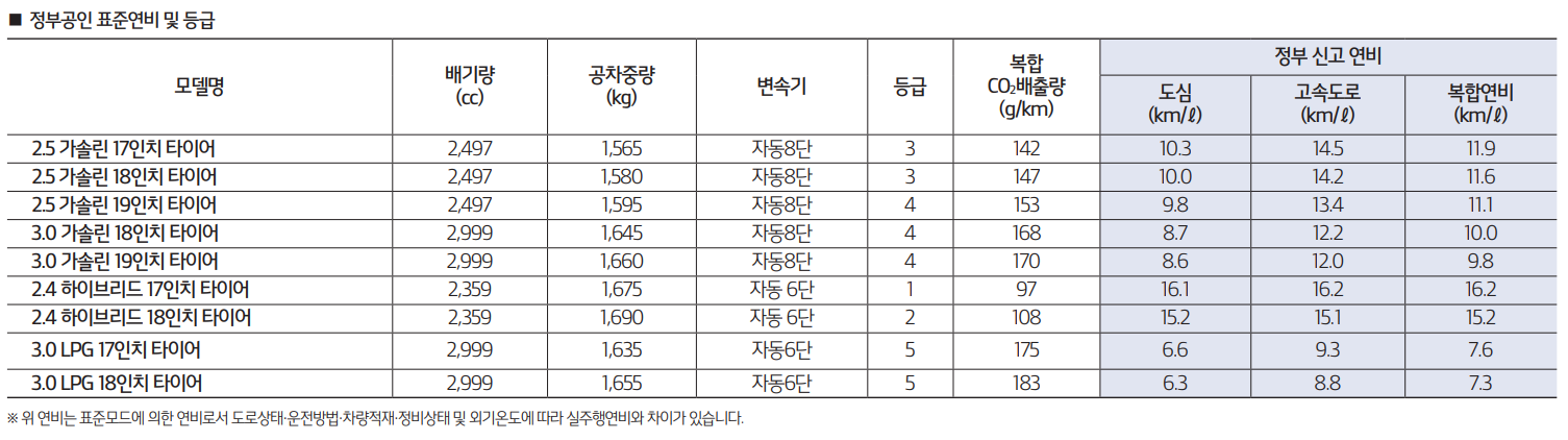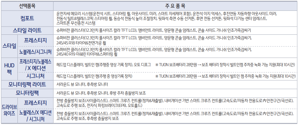 선택품목에 대한 세부 안내는 위의 3.0 LPG 모델과 동일하니 상단의 이미지를 참고 해주시기 바랍니다.