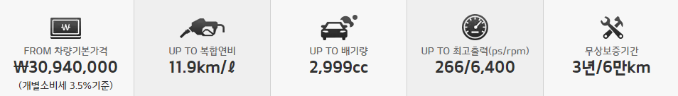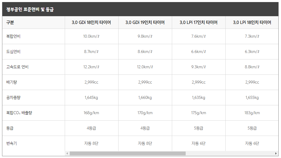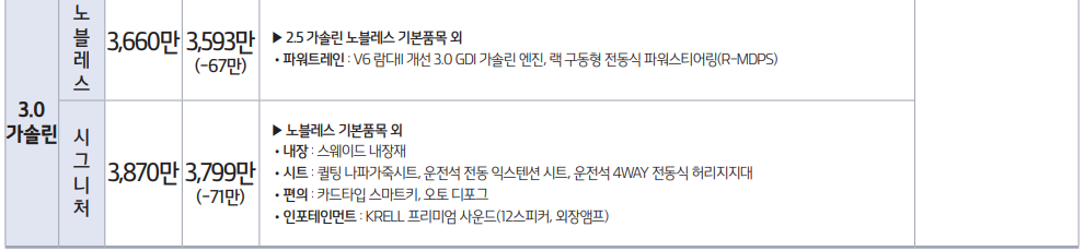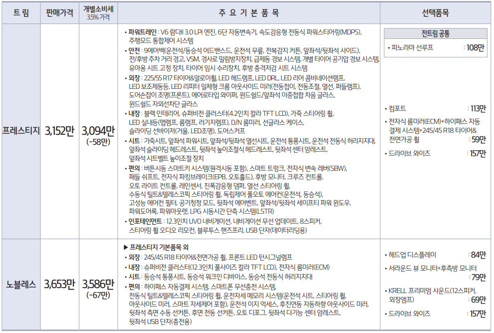 3.0 LPG 모델은 프레스티지와 노블레스 트림 2가지 입니다. 가격은 트림으로 보았을때 2.0 가솔린 보다는 조금하고 3.0 가솔린과 비교했을때는 가격이 차이가 납니다. 상세 기본 옵션은 상단의 이미지를 참고 해주시기 바랍니다.