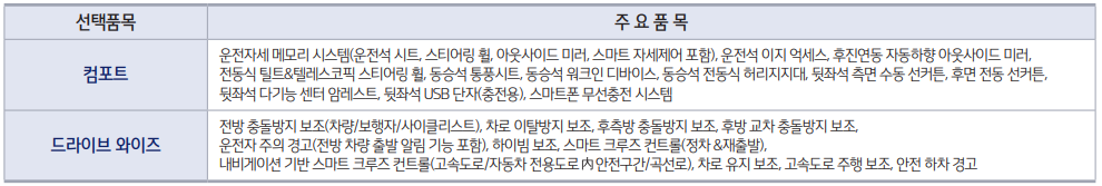 상세한 옵션별 내용입니다. 드라이브 와이즈를 보시면 스마트 크루즈 컨트롤, 전방 충돌방지 보조 등 안전성에 대한 기능으로 운전자의 안전을 위한 기능입니다. 잘 참고 하시기 바랍니다.