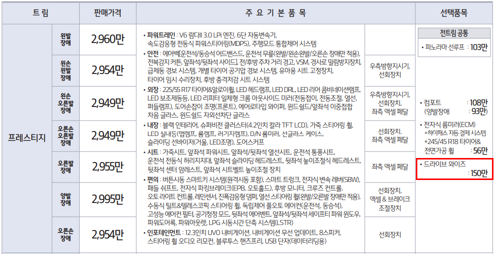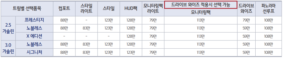 추천트림은 위에서 언급했듯이 드라이브 와이즈 입니다 그 외의 옵션은 편의성과 외장에 관한 옵션이니 원하시는 옵션을 잘 선택하시면 됩니다.