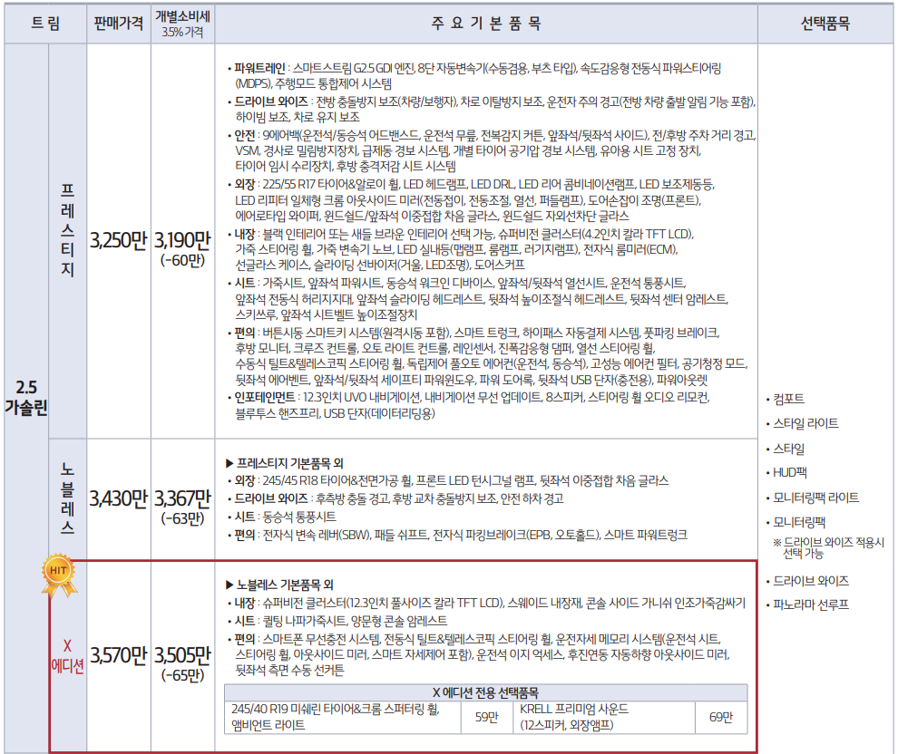 2.0 가솔린은 프레스티지, 노블레스, X에디션 3가지 트림으로 나뉘며, 3.0 가솔린은 노블레스, 시그니처 2가지 트림으로 분류 됩니다. 하위로 갈수록 고사양의 트림 입니다.