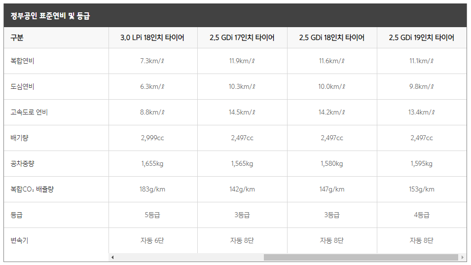 2020 K7 트림별 공인 연비 입니다. 보통은 복합연비를 따지는데, 살펴보면 타이어의 인치에 따라 그리고 배기량의 따라 7.3~11.9까지 차이가 납니다. 연비를 고려하시는 분들은 위의 자료를 참고 하시기 바랍니다.