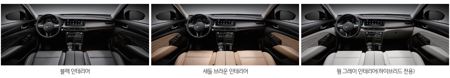 2020 K7 내부 디자인 색상은 블랙, 새들 브라운, 웜 그레이로 선택이 가능하며, 여기서 웜 그레이 내부 인테리어 색상은 하이브리드 전용이니 참고 하시기 바랍니다.